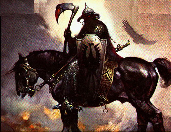 This Apocalypse demon is the most aggressive and combat oriented of the four. War is an incredibly powerful and capable warrior, strategist and tactician. He also has the ability to evoke anger, hatred and lust for power or vengeance in others through his words. War can make the participants in a dispute see red and quickly turn to violence, agitating mobs to loot, vandalize and murder. This ability is as much a part of the demon's arsenal as any of his weapons or supernatural powers. War i s a merciless and cold-blooded killer who thrives on combat and bloodletting. The demon is not interested in fair play or challenge, so he will fight dirty, cheat, lie and do anything to eliminate a foe. Furthermore, the monster murders young and old, male and female, the sick, sleeping and helpless, without hesitation or regret. In addition to being a weapons master, War can physically merge with weapons and war machines, making them a part of his body and uses them with expert skill. Of the four Apocalypse demons that must be destroyed, War will be the most deadly opponent.